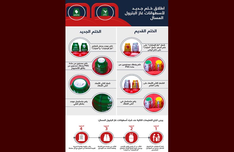 ويأتي “الختم” الجديد باللون الأخضر ويحمل صورة ثلاثية الأبعاد لشعاري “غاز الإمارات” و”امارات” إضافة إلى رقم متسلسل خاص بشكل أفقي يساعد على منع الموزعين غير المرخصين من التوزيع غير القانوني لاسطوانات غاز البترول المسال. وبخلاف ختم أسطوانات غاز البترول المسال القديم يأتي الختم الجديد مزوداً بغطاء مصنوع من رقائق الألمنيوم بما يجعل من المستحيل نسخه أو إعادة استعماله بعد إزالته للمرة الأولى.