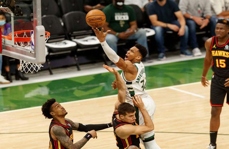 وفرض يانيس، أفضل لاعب في الدوري مرتين سابقا، سطوته بعد مباراة أولى عادية، من خلال قوته الجسدية، طوله الفارع وتحركاته السريعة الرائعة.