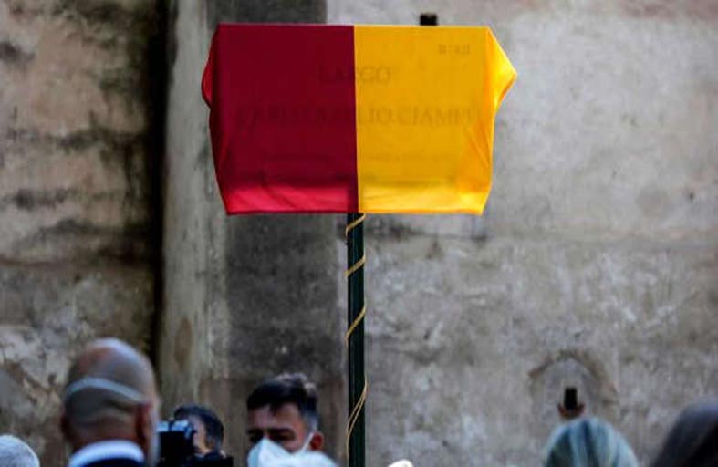 أطلقت بلدية روما اسم الرئيس السابق كارلو أزيليو تشامبي على إحدى ساحات العاصمة الإيطالية. لكن هذه المراسم لم تحدث بالشكل المرسوم لها بسبب خطأ مطبعي في صياغة الاسم على اللوحة الموضوعة في المكان.