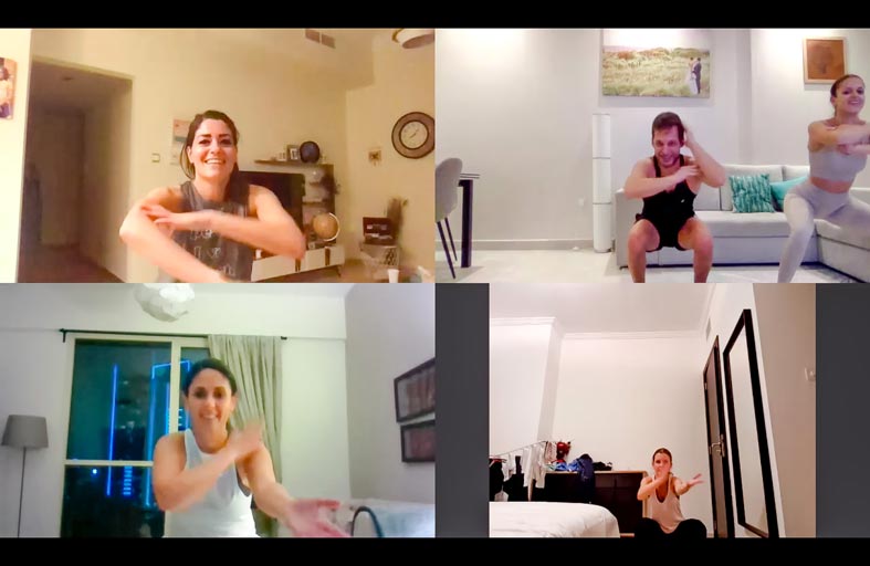 كما واصلت الصالات الرياضية ومراكز التدريب الرسمية ومدربو اللياقة البدنية المحترفين عرض برامجهم التدريبية بشكل يومي دون انقطاع وفي أوقات محددة لكي يتابعها الجمهور والتي يتم بثها بشكل مباشر لساعات طويلة على مدار أيام الأسبوع من خلال وسائل التواصل الاجتماعي ويتم فيها تقديم تدريبات لياقة بدنية منزلية ويتفاعل معها المئات من المتابعين بشكل متواصل.