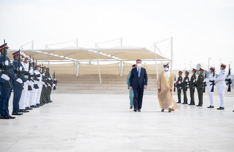 ولدى وصول معاليه إلى واحة الكرامة استعرض مع الشيخ خليفة بن طحنون آل نهيان مراسم حرس الشرف ثم وضع إكليلا أمام نصب الشهيد الذي يتكون من 31 لوحا يستند كل منها على الآخر كرمز للوحدة والتكاتف والتضامن بين قيادة دولة الإمارات وشعبها وجنودها الأبطال.