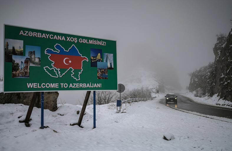 على مسافة أمتار قليلة، يراقب حارسان أرمينيان مزودان بندقيتي كلاشنيكوف، الحدود بشكل مستمر. إلى جانبهما لافتة موضوعة حديثا تقول إنك تدخل أذربيجان وخلفها يرفرف علم الدولة فوق معسكر مراقبة الحدود.