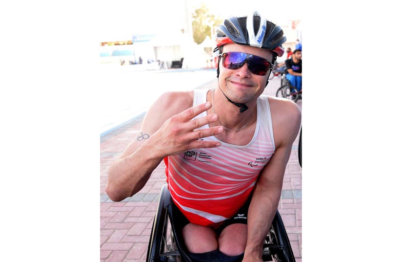 رفع مارسيل هوك لاعب منتخب سويسرا الحائز على 4 ميداليات ذهبية في "بارالمبية طوكيو" الأخيرة في مسابقات 800 متر و1500 متر و5000 متر والماراثون على الكراسي المتحركة.. شعار "تحدي النخبة" بعد وصوله للمشاركة في" دولية " فزاع لألعاب القوى لأصحاب الهمم التي انطلقت أمس على مضمار نادي دبي لأصحاب الهمم.