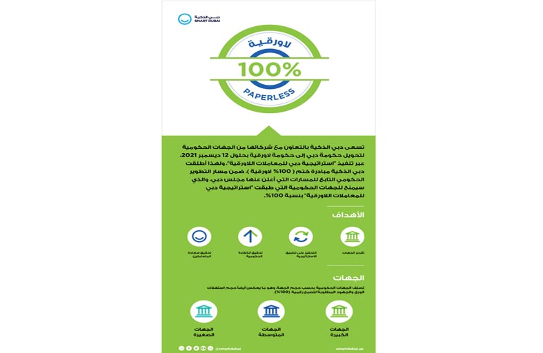 أعلنت دبي الذكية عن إطلاق مبادرة ختم 100 بالمائة لاورقية التي تهدف إلى منح الجهات الحكومية التي أنجزت تنفيذ استراتيجية دبي للمعاملات اللاورقية بنسبة 100 بالمائة ختما يكون علامة فارقة تبين تحولها بشكل كامل إلى جهات ذات خدمات وعمليات رقمية ولا ورقية وذلك ضمن مشاريع مسار التطوير الحكومي التابع للمسارات التنموية الستة التي أعلن عنها مجلس دبي . وقالت سعادة الدكتورة عائشة بنت بطي بن بشر مدير عام دبي الذكية إن المبادرة تواكب سعي دبي الذكية الحثيث لتسريع وتيرة التحول الرقمي لحكومة دبي، لتحقيق مستهدفات استراتيجية دبي للمعاملات اللاورقية”، والمتمثلة في تحويل كافة المعاملات الحكومية الداخلية ومعاملات الحكومة مع المتعاملين لتصبح رقمية ولاورقية بحلول ديسمبر 2021، مشيرة إلى أن هذا الأمر سيسهم كذلك في تحفيز الجهات الحكومية الأخرى لاستكمال تنفيذ وتطبيق الاستراتيجية وتسريع الإنجاز وهو ما يصب في تحقيق الهدف الأسمى لجعل دبي المدينة الأذكى والأسعد على وجه الأرض. وتصنف مبادرة ختم 100 بالمائة لاورقية جهود الجهات الحكومية وفقاً للجهود المطلوبة لتحولها إلى رقمية بشكل كامل من خلال حجم استهلاك الورق عبر ثلاثة أنواع وهي: الجهات الكبيرة والمتوسطة والصغيرة، ويقدم الختم للجهات التي حققت نسبة 100 بالمائة في إنجازها لـ استراتيجية دبي للمعاملات اللاورقية وضمن الفئة التي تنتمي لها فقط، وسيتم الإعلان عن نتائج الجهات بشكل نصف سنوي وتقليد الختم للجهات التي وصلت للنسبة بناءً على ذلك. وحسب إحصاءات دبي الذكية بنهاية 2019 وبناءً على تقارير الجهات الحكومية فقد وصلت بعض الجهات إلى نسبة إنجاز أكثر من 60 بالمائة مثل هيئة كهرباء ومياه دبي والقيادة العامة لشرطة دبي وهيئة الطرق والمواصلات والإدارة العامة للإقامة وشؤون الأجانب - دبي عن فئة الجهات الكبيرة ودائرة الأراضي والأملاك عن فئة الجهات المتوسطة ودائرة التنمية الاقتصادية وهيئة المعرفة والتنمية البشرية ودائرة السياحة والتسويق التجاري وهيئة تنمية المجتمع عن فئة الجهات الصغيرة. وتسعى استراتيجية دبي للمعاملات اللاورقية إلى توفير أكثر من مليار ورقة تستخدم في حكومة دبي كل عام مما ينقذ 130 ألف شجرة بالإضافة إلى ذلك سيوفر سكان و زوار دبي 40 ساعة للشخص الواحد في السنة وأكثر من 900 مليون درهم كانت ستنفق على المعاملات الورقية.