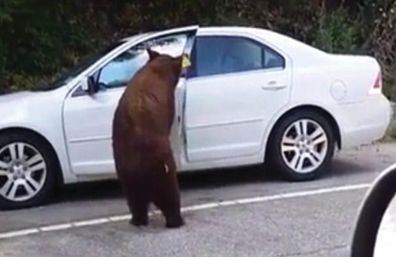 ولم يعبأ الدب البني بأصوات الركاب ومحاولاتهم إبعاده، لكن أيا من الثلاثة لم يتأذ، حيث بدا أن الدب يحاول اللعب بهم، ولم يصب سوى سطح السيارة ببعض الخدوش، ثم نزل وتركهم ماضياً في سبيله، غير أن الفيديو الطريف تم تداوله على نطاق واسع.