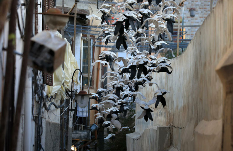 بين ليلة وضحاها، استيقظَ سكان حارات ضيقة في دمشق القديمة على مشهد غير مألوف، بعدما زيّنت 15 ألف حمامة مصنوعة من الخزف المكان، في إطار معرض تجهيز جماعي يروي سيرة سنوات الحرب والأمل بغد أفضل. ويجسّد المعرض الذي يحمل عنوان "كان يا ما كان.. شباك" ويشارك فيه 16 طالباً من كلية الفنون الجميلة حلم أستاذتهم بثينة العلي التي خططت لإقامة المعرض قبل 11 عاماً، لكن اندلاع النزاع الذي بدأ باحتجاجات شعبية أجّل حلمها وبقيت حماماتها مخبأة في مستودعات محصنة طيلة السنوات الماضية. وتقول العلي (48 عاماً) لوكالة فرانس برس "كنتُ أحلم أن أزيّن وسط مدينتي وأعلق الحمامات في مكان مكتظّ ليراها الناس يومياً، لكن الحرب غيّرت كلّ شيء، واضطررتُ إلى تأجيل حُلمي كل هذا الوقت". واضطرت العلي كذلك إلى "تغيير مكان العرض إلى جزء أحبه في مدينتي وهو دمشق القديمة".