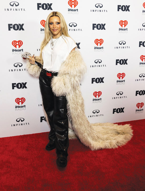دوجا كات الفائزة بأكثر فنانة هذا العام عزفًا، خلال حفل توزيع جوائز iHeartRadio Music Awards في لوس أنجلوس. رويترز