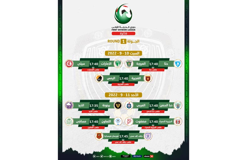 تنطلق مساء اليوم السبت منافسات بطولة دوري الدرجة الأولى للموسم الرياضي 2022 – 2023 بمشاركة 17 فريقاً سيتنافسون على مدار 34 جولة بنظام الدوري الكامل من دورين ذهاباً وإياباً بهدف الحصول على إحدى البطاقتين المؤهلتين إلى مسابقات المحترفين الموسم المقبل . وتشهد النسخة الحالية من المسابقة مشاركة فرق: الإمارات، العروبة، الفجيرة، حتا، الحمرية، دبا الحصن، مسافي، الذيد، العربي، التعاون، مصفوت، الجزيرة الحمراء، الرمس، جلف، سيتي، فرسان هيسبانيا، بينونة. وتٌقام في اليوم الأول ثلاث مباريات تجمع الأولى حتا مع العروبة في ملعب حمدان بن راشد ، ويلتقي في المباراة الثانية الفجيرة مع الرمس في ملعب الفجيرة فيما تجمع المباراة الثالثة الإمارات مع سيتي في ملعب الإمارات . وتُقام جميع المباريات في تمام الساعة 17:40 مساء . وتُستكمل مباريات الأسبوع الأول يوم الأحد بإقامة 5 مباريات ، حيث يلتقي بينونة مع الذيد في ملعب الذيد الساعة 17:35 ، والجزيرة الحمراء مع مصفوت في ملعب سعود بن صقر القاسمي الساعة 17:40 ، ويلتقي التعاون مع مسافي في ملعب التعاون الساعة 17:40 ، ويستضيف الحصن في ملعبه العربي الساعة 17:40 فيما يواجه جلف اف سي فرسان هيسبانيا في ملعب حميد الطاير بنادي النصر الساعة 17:45 .