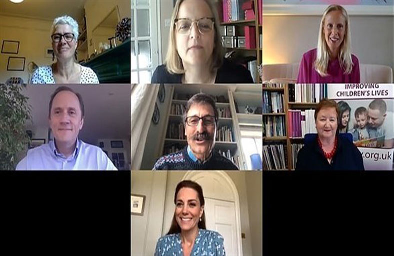 أجرت كيت ميدلتون دوقة كمبردج اتصالات بالفيديو بعدد من الآباء والأمهات الجدد وبعض القابلات وآخرين من العاملين في مجال رعاية الأمومة للترويج لرسالتها للتوعية بأهمية مراعاة الصحة النفسية خلال جائحة فيروس كورونا المستجد.