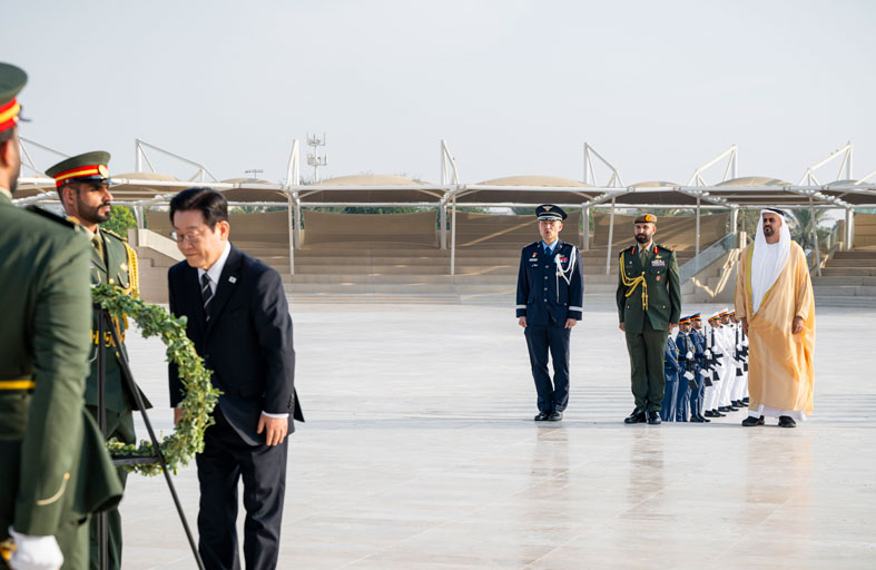 واستعرض فخامة رئيس جمهورية كوريا، يرافقه سموّ الشيخ ذياب بن محمد بن زايد آل نهيان، حرس الشرف الذي اصطفَّ لتحيته، ثمَّ وضع إكليلاً من الزهور أمام نصب الشهيد.