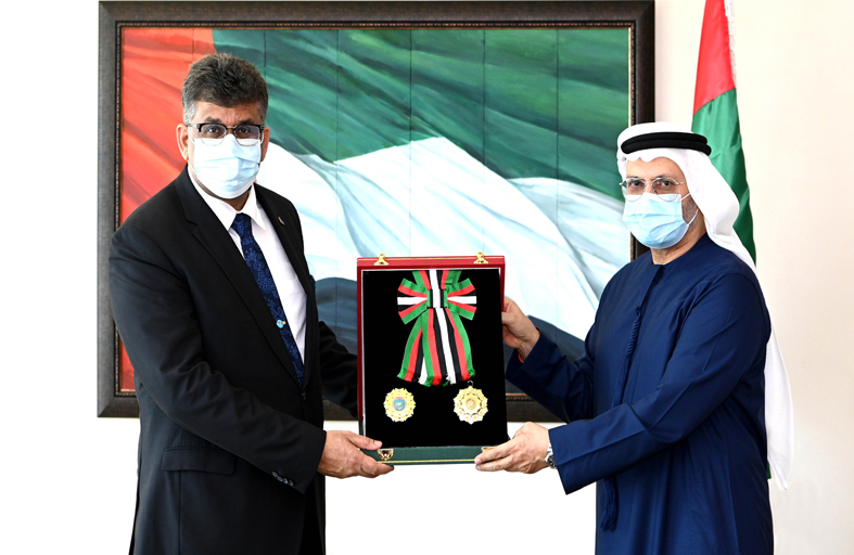 وقلد معالي الدكتور أنور بن محمد قرقاش وزير الدولة للشؤون الخارجية السفير الوسام خلال استقباله له في ديوان عام وزارة الخارجية والتعاون الدولي، مثمّناً تطور علاقة دولة الإمارات مع جمهورية فيجي في شتى المجالات، ومتطلّعاً إلى دفعها إلى نطاق أرحب خلال المرحلة المقبلة. وشكر معالي الدكتور أنور قرقاش جهود السفير شاشي براكاش في تعزيز هذه العلاقة خلال فترة عمله لدى الدولة. كما أبدى معاليه شكره للسفير على ما بذله من جهود لتوسيع نطاق العلاقات وتعزيزها، معرباً عن أمنياته له بالتوفيق والنجاح.