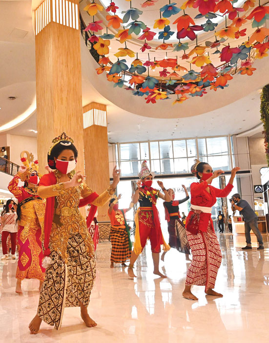 راقصات يلتزمن بأقنعة الوجه وهن يرتدين ملابس تقليدية ويرقصن احتفالاً بعيد استقلال إندونيسيا. ا ف ب
