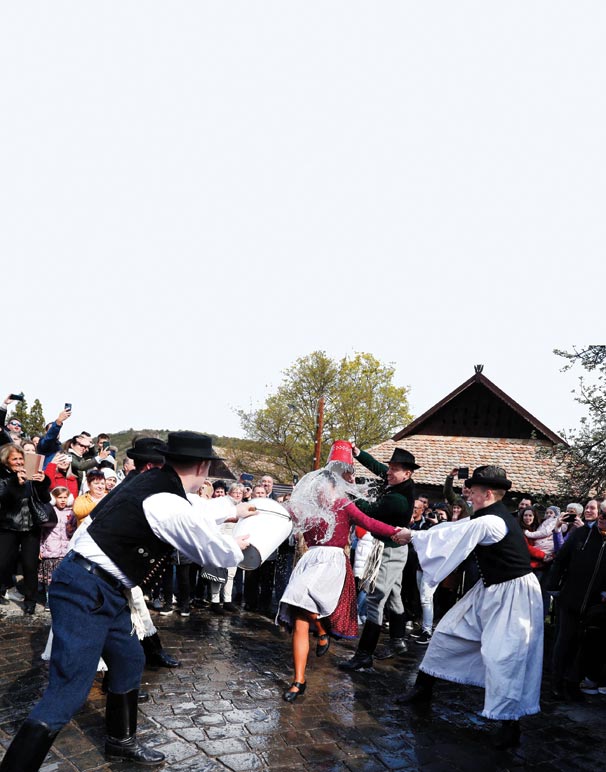 رجال يرتدون ملابس تقليدية يلقون الماء على امرأة كجزء من احتفالات عيد الفصح التقليدية في هولوكو، المجر. رويترز
