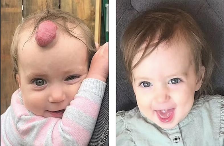 نجت طفلة رضيعة كندية تبلغ من العمر عاماً واحداً من الموت، بعدما أصيبت بورم مكون من أوعية دموية استمرت بالتزايد في جبينها، بفضل عملية جراحية استغرقت ثلاث ساعات.