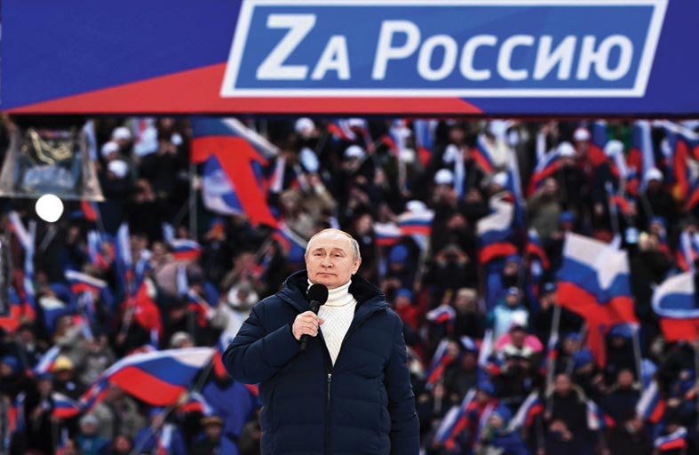 كما استغل الرئيس الروسي بوتين تجمعا حاشدا أمام استاد مكتظ بالجموع أمس ليسوق مبررات للعملية العسكرية ووعد عشرات الألوف من الحاضرين الذين يلوحون بالأعلام الروسية بأن جميع أهداف الكرملين ستتحقق.