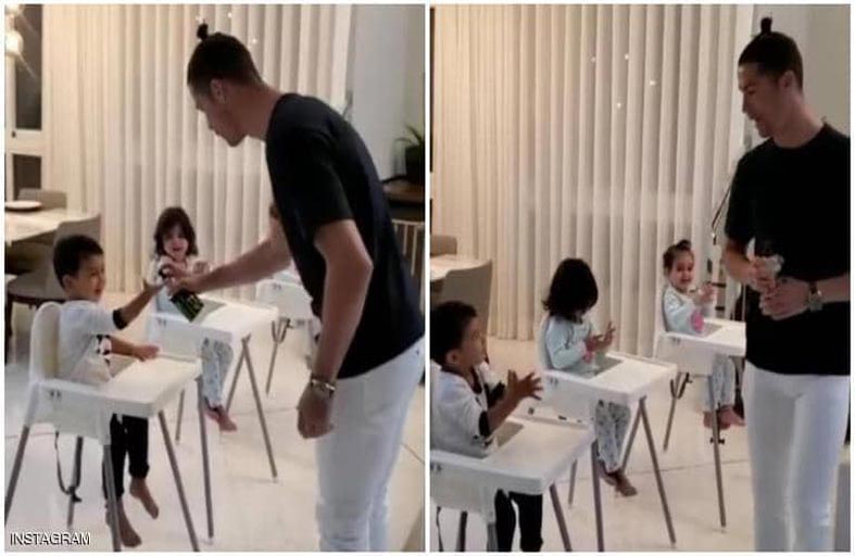 ونشر رونالدو الفيديو على حسابه بتطبيق إنستغرام، وأرفقه بعبارة "ابق بالمنزل"، ولاقى الفيديو إعجابا كبيرا من الجماهير التي أثنت النجم البرتغالي على تعماله اللطيف والحريص مع أطفاله الصغار.