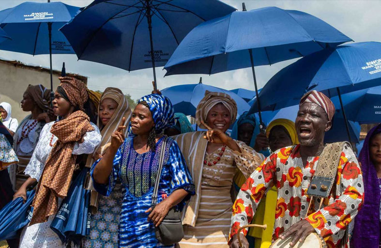 على إيقاع الطبول، سارت عشرات الشابات النيجيريات اللواتي ارتدينَ فساتين زاهية الألوان وحملن مظلات زرقاء كبيرة تقيهنّ أشعة الشمس، في موكب استعراضي لمناسبة إقامة زفاف جماعي لهنّ في ولاية كوارا بغرب البلاد، في تقليد سنوي قديم.