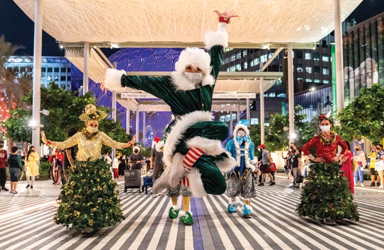 بأزيائهم الملوّنة والمرحة على شكل أشجار عيد الميلاد، والأقزام، وجنود كسارة البندق، نشر فنانو الشارع روح عيد الميلاد في أنحاء موقع إكسبو 2020 دبي، وذلك عبر منح الزائرين فرصاً لالتقاط صور فوتوغرافية لا تُنسى، وفرصة للغناء مع أغاني العطلات. وتوقف الزوار المتحمسون لالتقاط الصور مع فناني الأداء، فيما شارك آخرون بالغناء مع فناني العروض الترفيهية الذين عزفوا أغاني الكريسماس الشهيرة التي تضمنت أغنية“It’s Beginning to Look A lot Like Christmas” ، وأغنية “Rudolph The Red Nosed Reindeer”، وأغنية .“All I Want For Christmas is You”