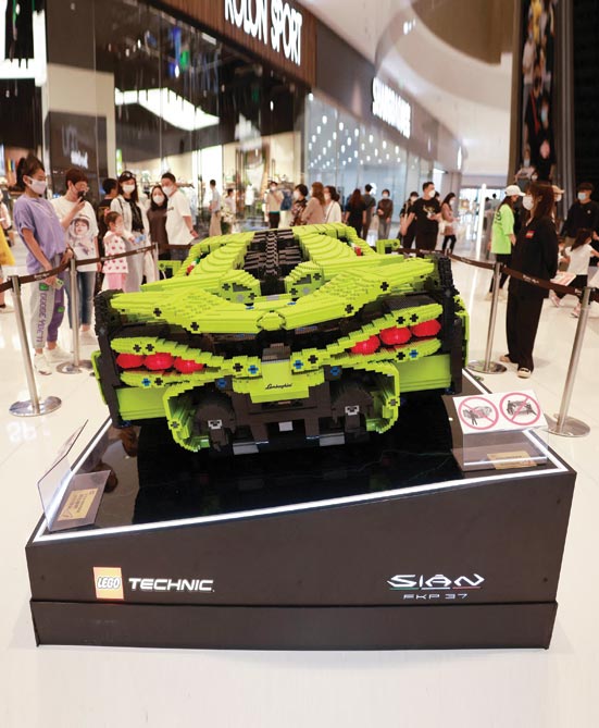 زوار ينظرون إلى نموذج يشبه سيارة لامبورغيني مصنوع من قطع تستخدم في الألعاب في مركز تسوق في شنيانغ بمقاطعة لياونينغ شمال شرق الصين. ا ف ب