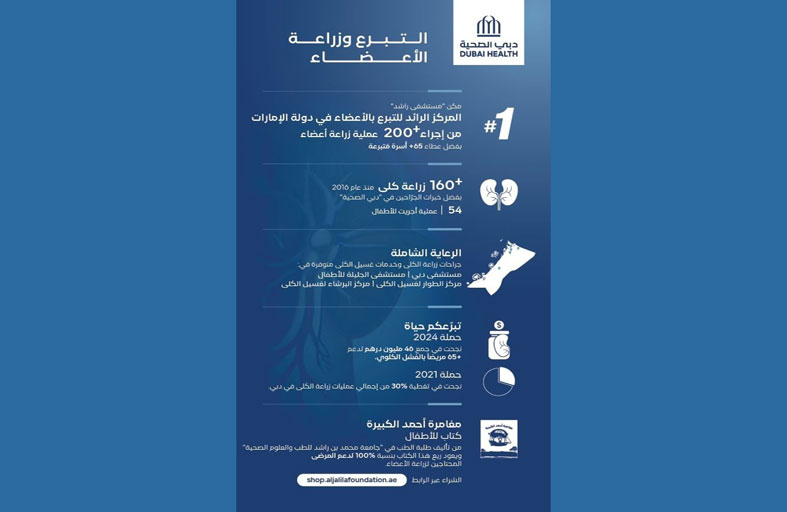 وتحرص "دبي الصحية" على تقديم أعلى مستويات الرعاية الصحية ومنح الأمل للمرضى الذين يخضعون لعمليات زراعة الأعضاء حيث أطلقت "مؤسسة الجليلة"، ذراع العطاءلـ "دبي الصحية"النسخة الثانية من حملة "تبرعكم حياة" لجمع التبرعات لصالح عمليات زراعة الكلى،بهدف المساهمة في جمع تبرعات تتجاوز 46 مليون درهم لإنقاذ حياة أكثر من65مريضاً يعانون من الفشل الكلوي، وذلك من خلال تغطية تكاليف العمليات الجراحية، وجلسات غسيل الكلى، والرعاية اللازمة في مرحلة ما بعد عملية الزراعة.