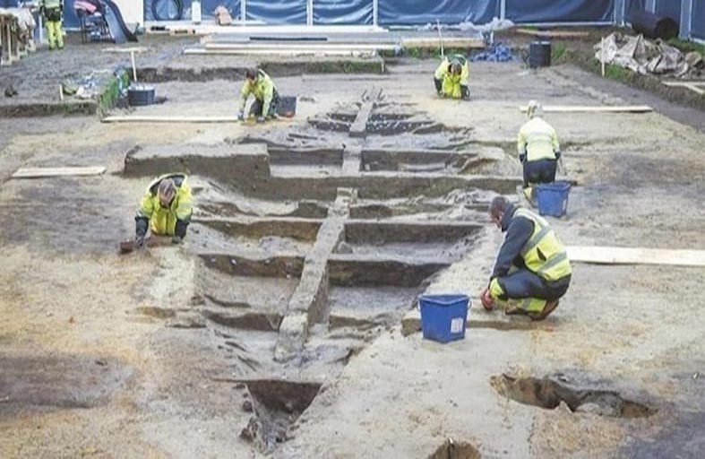 تحت خيمة كبيرة بيضاء ورمادية اللون نصبت في قلب حقل يضمّ مقبرة كبيرة بالقرب من مدينة هالدن في جنوب شرق النروج، ينقّب نحو عشرة علماء في الأرض، ممدّدين أو راكعين وهم يرتدون سترات فاقعة اللون. وقد اكتشفت ملامح هذه السفينة المطمورة في الأرض سنة 2018 بواسطة رادار جيولوجي لخبراء تنبّهوا إلى جثوة قريبة. وكشفت العيّنات الأولى أن التآكل بات في مرحلة متقدّمة، فأطلقت أعمال التنقيب على وجه السرعة.