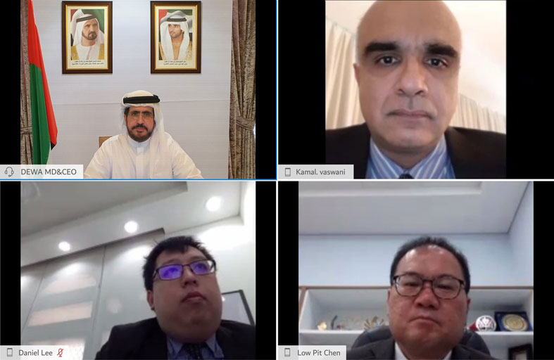 بحث معالي سعيد محمد الطاير، العضو المنتدب الرئيس التنفيذي لهيئة كهرباء ومياه دبي مع سعادة: كمال آر فاسواني، سفير جمهورية سنغافورة لدى دولة الإمارات العربية المتحدة، و سعادة: لو بيت تشين، القنصل العام لجمهورية سنغافورة في دبي والإمارات الشمالية، عبر تقنية الاتصال المرئي، سبل تعزيز التعاون المشترك وتبادل أفضل الممارسات والخبرات العالمية خاصة في مجالات الطاقة النظيفة.