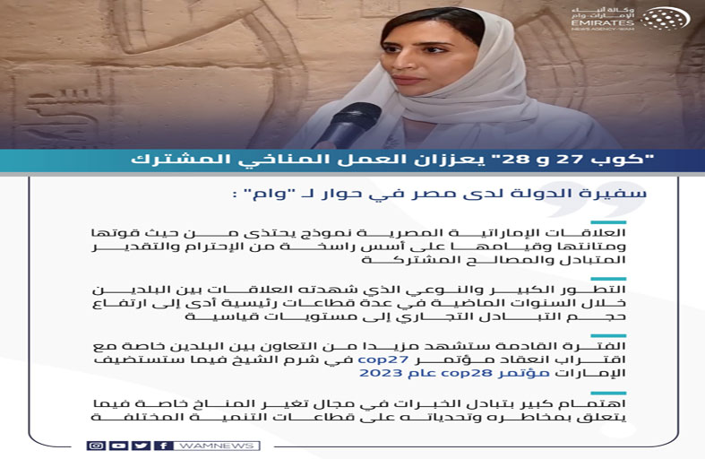 وعن استضافة مصر لمؤتمر كوب 27 والإمارات لمؤتمر كوب 28 ، قالت سعادتها إن الفترة القادمة ستشهد مزيدا من التعاون بين البلدين خاصة مع اقتراب انعقاد مؤتمر الدول الأطراف في اتفاقية الأمم المتحدة للتغير المناخي cop27 في شرم الشيخ، فيما ستستضيف دولة الإمارات مؤتمر cop28 عام 2023، لافتة إلى الاهتمام الكبير بتبادل الخبرات في مجال تغير المناخ خاصة فيما يتعلق بمخاطره وتحدياته على قطاعات التنمية المختلفة، وذلك على ضوء الأهمية الكبيرة التي يحظى بها المؤتمران على المستوى الدولي في تحقيق تقدم ملموس في قضايا البيئة عالمياً.