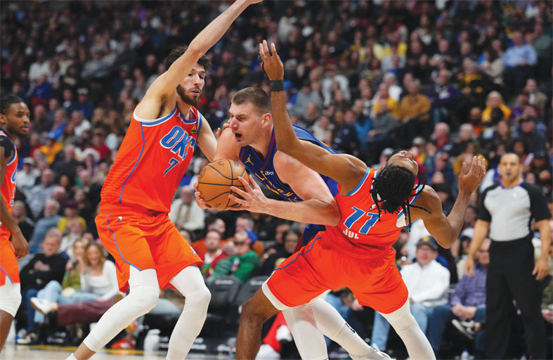 مُني دنفر ناغتس حامل اللقب بهزيمة قاتلة أمام ضيفه أوكلاهوما سيتي ثاندر 117-118 بسلة في الثانية الأخيرة من اللقاء، فيما ألحق فيلادلفيا سفنتي سيكسرز بمضيفه تشارلوت هورنتس أكبر هزيمة في تاريخه بالفوز عليه 135-82 في دوري كرة السلة الأميركي للمحترفين.