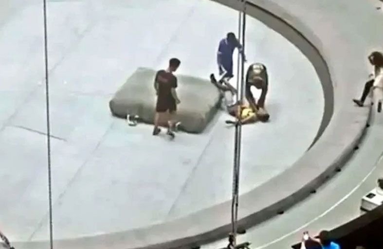 ورغم أنه سقط أولًا على بساط الحماية المخصص لهذه العروض، إلا أن قوة الاندفاع دفعته للانزلاق وارتطام رأسه بقوة على أرضية العرض الصلبة، مما أدى إلى إصابته بإصابة شديدة في الرأس وكسر ضاغط في العمود الفقري، بحسب التقارير الطبية الأوّلية.
