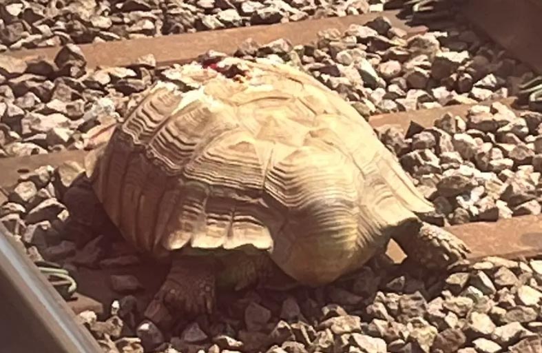 وأوضحت راكبة أحد القطارات ديان أيكرز عبر تويتر أن "ثمة سلحفاة عملاقة على خط نورويتش لا تزال على قيد الحياة لكنها مصابة"، ونشرت صورة للسلحفاة بدت فيها آثار الجرح واضحة في أعلى قوقعتها.