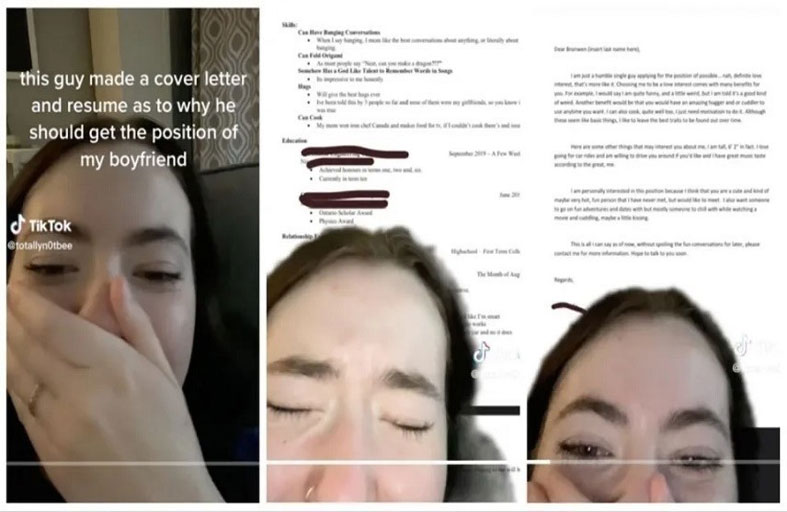 ونشرت الفتاة تحت اسم Bee (@ definitelyn0tbee) مقطع فيديو تكشف فيه عن الطلب الذي تقدم به حبيبها المحتمل، مع تعليق قالت فيه "هذا الشاب قدم خطاباً مع سيرة ذاتية يوضح فيها لماذا يجب أن يكون حبيبي".