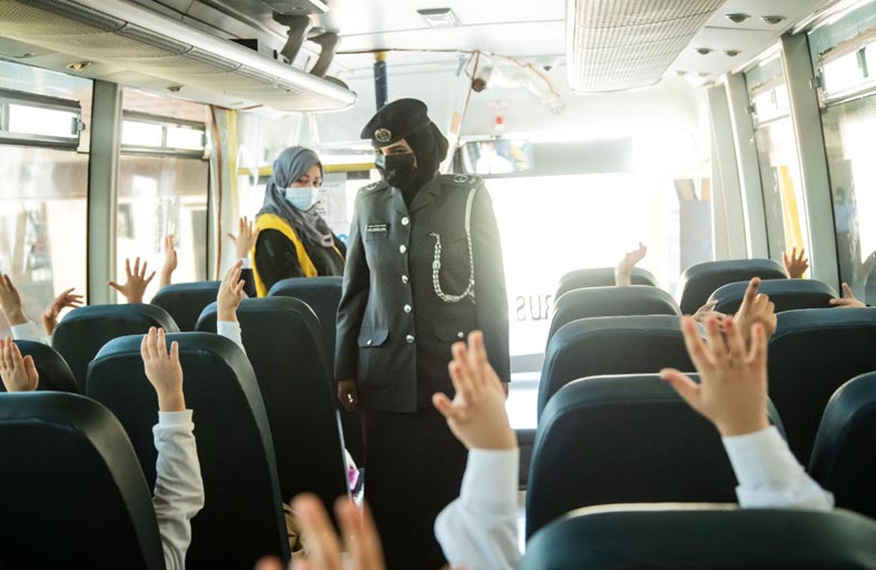 رافقت شرطة أبوظبي الطلاب في رحلتهم الصباحية منذ لحظة صعودهم للحافلة المدرسية بالقرب من منازلهم وفاجأتهم بالهدايا الترحيبية قبل وصولهم إلى مدارسهم وذلك بهدف الاطمئنان على إجراءات سلامتهم، بالتعاون مع مؤسسة مواصلات الإمارات.