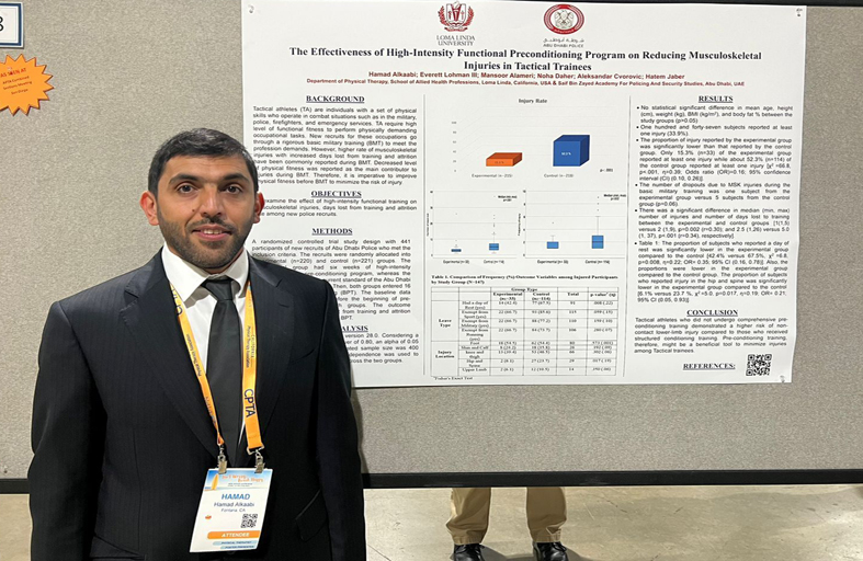 شاركت القيادة العامة لشرطة أبوظبي في مؤتمر جمعية العلاج الطبيعي الذي عقد مؤخراً في مدينة لوس أنجلوس بالولايات المتحدة الأمريكية ، وتميزت للمرة الثانية عالمياً بعرض نتائج مشروع بحث قياس كفاءة العسكريين الأول من نوعه على مستوى الشرق الأوسط بعد اختياره سابقاً من ضمن نحو 1000 بحث علمي عالمي متخصص في أكبر مؤتمر عالمي بالولايات المتحدة الأمريكية.