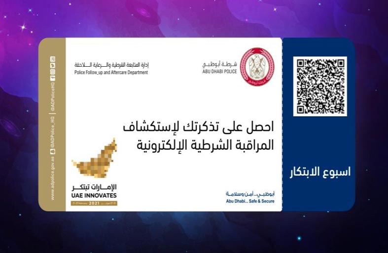 أكدت شرطة أبوظبي أهمية دعم الأفكار المبتكرة التي تقدم حلولاً ابتكارية للتحديات المستقبلية وتطبيقها على أرض الواقع وتزامنا مع أسبوع الابتكار تحت شعار "الامارات تبتكر 2021" ابتكرت ادارة المتابعة الشرطية والرعاية اللاحقة تذكرة لاستكشاف خريطة طريق المراقبة الشرطية الإلكترونية "السوار الإلكتروني" من خلال الباركود في التذكرة.