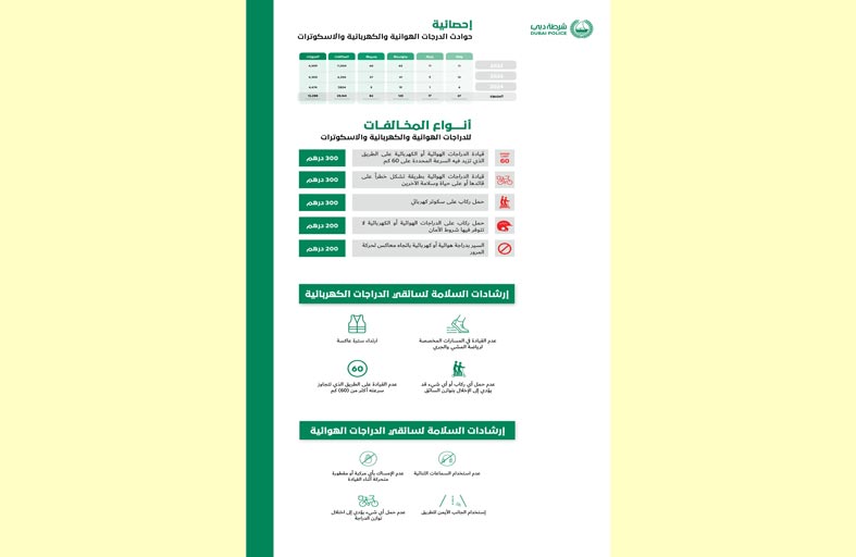 وأوضح اللواء الغيثي أن مخالفة قيادة الدراجة الكهربائية أو الهوائية على الطريق الذي تزيد السرعة المحددة فيه على 60 كلم في الساعة، تبلغ غرامتها 300 درهم، ومخالفة قيادة الدراجة الهوائية بطريقة تشكل خطر على قائدها أو على حياة وسلامة الآخرين غرامتها 300 درهم، ومخالفة حمل راكب على سكوتر كهربائي غرامتها 300 درهم، ومخالفة حمل راكب على الدراجة الهوائية أو الكهربائية لا تتوفر فيها التجهيزات اللازمة لذلك غرامتها 200 درهم، ومخالفة السير بدراجة كهربائية أو هوائية عكس اتجاه حركة المرور غرامتها 200 درهم.