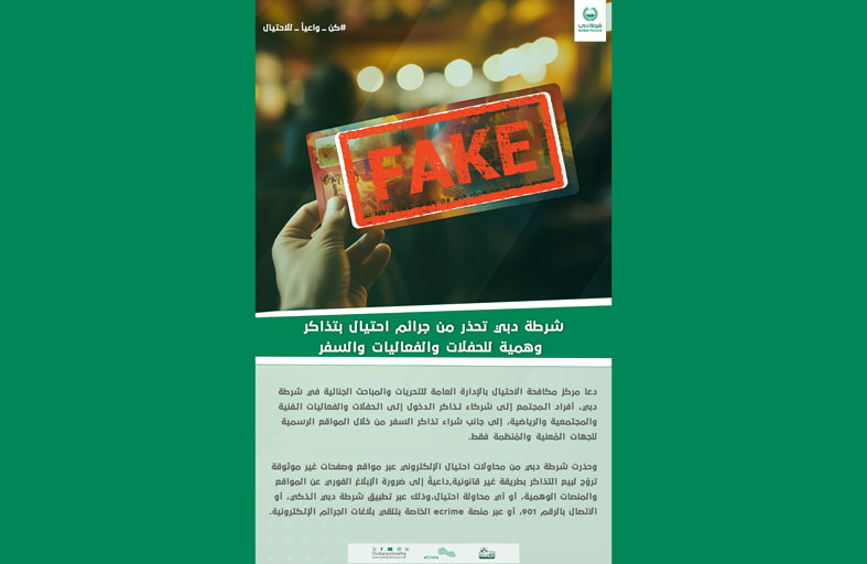 دعا مركز مكافحة الاحتيال بالإدارة العامة للتحريات والمباحث الجنائية في شرطة دبي، أفراد المجتمع إلى شركاء تذاكر الدخول إلى الحفلات والفعاليات الفنية والمجتمعية والرياضية، إلى جانب شراء تذاكر السفر من خلال المواقع الرسمية للجهات المُعنية والمُنظمة فقط.