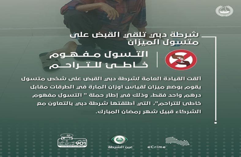 ألقت القيادة العامة لشرطة دبي القبض على شخص متسول، يضع ميزاناً لقياس أوزان المارة في الطرقات مقابل درهم واحد فقط، وذلك في إطار حملة "التسول مفهوم خاطئ للتراحم"، التي أطلقتها شرطة دبي بالتعاون مع الشركاء قبيل شهر رمضان المبارك.