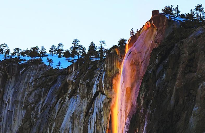وفي كل عام، ولفترة وجيزة، تضيء أشعة النهار الأخيرة قبل المغيب شلالات هورستايل، في مشهد شبيه بتدفق للحمم البركانية أسفل منحدر إل كابيتان الصخري الشهير.