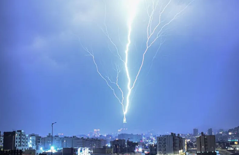 في مشهد مهيب، رصدت عدسات الكاميرات، مساء أمس الأول الأربعاء، صاعقة لامست برج الساعة في مكة المكرمة.