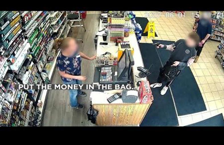 ويمكن سماع العاملة تسأله بالقول: "ماذا تفعل؟ هل أنت جاد؟"، الأمر الذي جعل الصبي يطلق طلقة تحذيرية في سقف المحل التجاري.