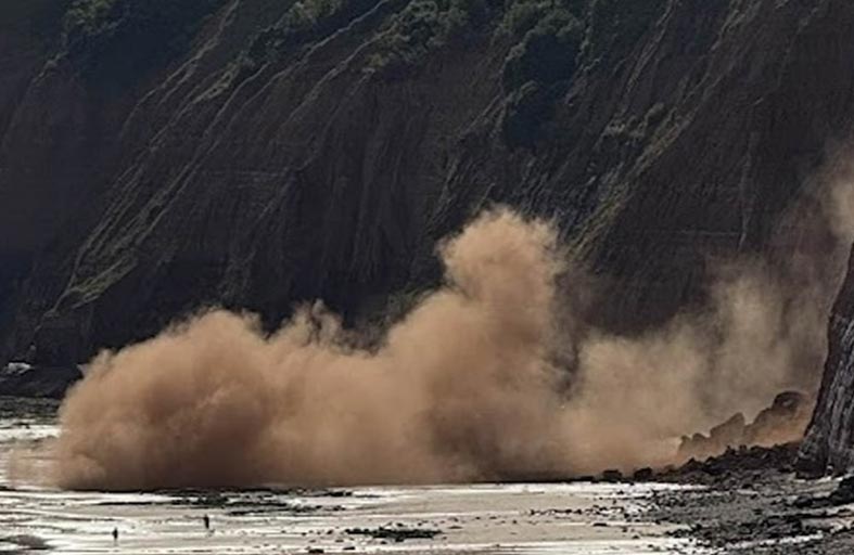 أظهر مقطع فيديو يحبس الأنفاس لحظة تصاعد سحابة كثيفة من الغبار إثر الانهيار الصخري، ما أجبر مرتادي شاطئ جاكوب لادر على الهروب نحو البحر في منطقة سيدموث السياحية.