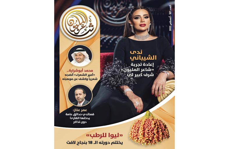 وتضمن العدد حوار مع مقدمة برنامج “شاعر المليون” في موسمه العاشر الإعلامية ندى الشيباني التي تحدثت عن مسيرتها الإعلامية في مجال التقديم التلفزيوني، وتجربتها في البرنامج التي منحتها مساحة جديدة للتعلم واكتساب مهارات جديدة في التقديم، وأن أجمل اللحظات التي أحبتها بالبرنامج هو اختلاف الخروج الإيجابي عن النص والارتجال، أما شغف جمهور الشعر فحمّلها مسؤولية جميلة، معتبرة أن إعادة التجربة شرف كبير لها.