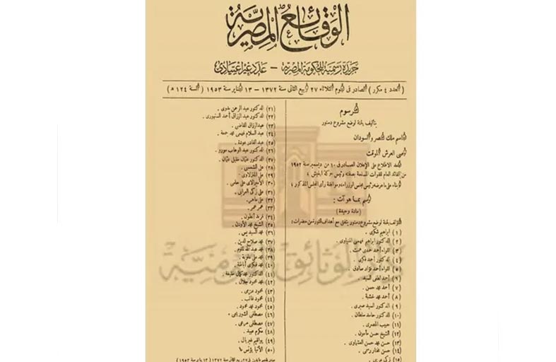 وفي إحدى تلك الوثائق، نشرت جريدة "الوقائع" الرسمية، مرسوما بتاريخ 13 يناير 1953، بتأليف لجنة لوضع مشروع دستور للبلاد، "يتفق مع أهداف ثورة يوليو".