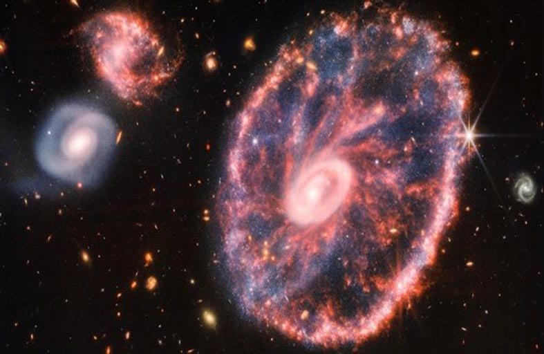 نشرت وكالة الفضاء الأمريكية "ناسا" صورة نادرة ومذهلة لمجرّة تبعد 500 مليون سنة ضوئية هي مجرّة عجلة العربة التي تظهر حلقاتها بوضوح لم يسبق له مثيل بفضل تلسكوب جيمس ويب الفضائي الجديد.