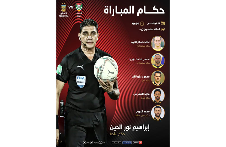 يدير طاقم تحكيم من جمهورية مصر العربية بقيادة الحكم إبراهيم نور الدين المباراة الودية التي تجمع كلا من منتخبنا الوطني ونظيره الأرجنتيني، اليوم على استاد محمد بن زايد.