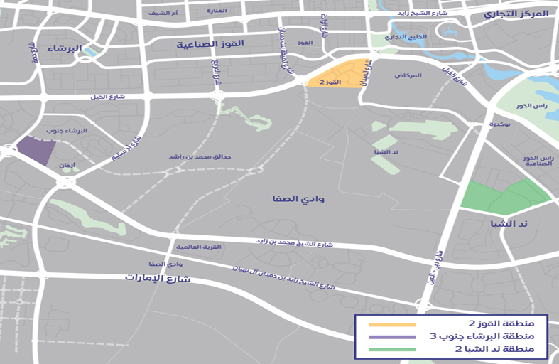 أرست هيئة الطرق والمواصلات بدبي عقد مشروع تنفيذ طرق داخلية في ثلاث مناطق سكنية هي القوز الثانية وند الشبا الثانية والبرشاء جنوب الثالثة بطول إجمالي 34.4 كيلومتر ويتوقع الانتهاء من المشروع في النصف الثاني من عام 2022.