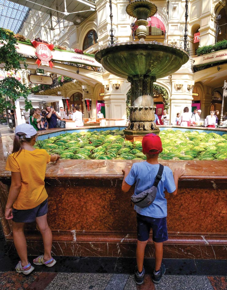 طفل وطفلة ينظران إلى نافورة مليئة بالبطيخ في متجر GUM وسط موسكو. (ا ف ب)