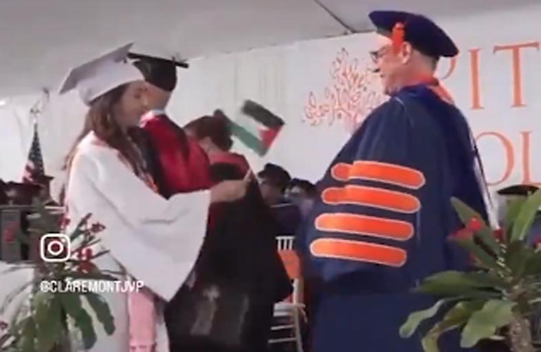 وبالتوازي مع ذلك ضجَّت القاعة التي شهدت حفل التخرج بهتافات الطلّاب المؤيدة لفلسطين، وهم يرفعون أعلامًا فلسطينية بالحجم ذاته.