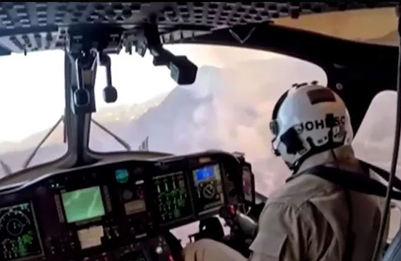ويظهر في الفيديو الطياران وهما يسقطان من مروحية المياه وموادا مثبطة للنيران على تلال في باليساديس.