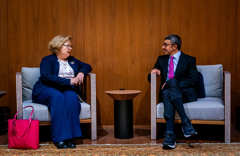 كما تطرقت المباحثات إلى ملف المناخ ، وأهمية استثمار هذه المنصة الأممية لحشد الجهود الدولية لمواجهة تداعيات التغير المناخي ، لاسيما مع انعقاد قمة الطموح المناخي على هامش أعمال الدورة الـ 78 للجمعية العامة للأمم المتحدة. وأطلع سمو الشيخ عبدالله بن زايد آل نهيان، أصحاب المعالي وزراء الخارجية على استعدادات دولة الإمارات لاستضافة الدورة الثامنة والعشرين من مؤتمر الأطراف في اتفاقية الأمم المتحدة الإطارية بشأن تغير المناخ "COP28" خلال شهري نوفمبر وديسمبر المقبلين في مدينة إكسبو دبي.